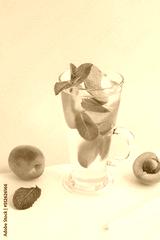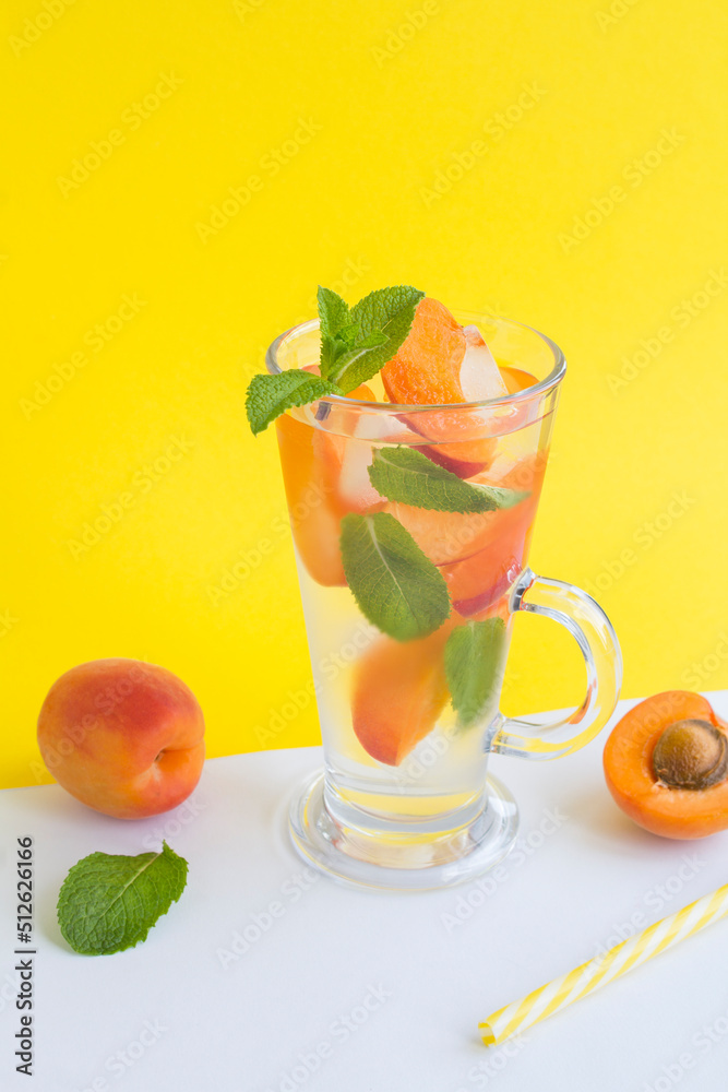 Infused water with apricot and mint in the drinking glass on the yellow background. Closeup. Location vertical.