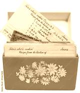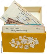 Old, yellow 1960s recipe box with handwritten recipes on index cards.