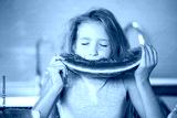 Happy little girl eating fresh ripe watermelon for healthy breakfast