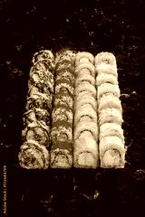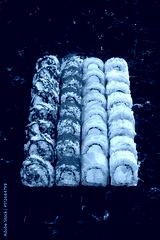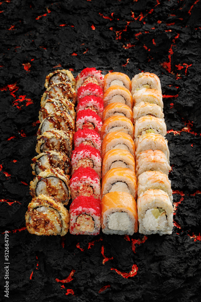 Japanese cuisine. Fresh Sushi rolls set over black background. Japanese seafood sushi. Tuna Roll, Ebi roll. Tempura with salmon