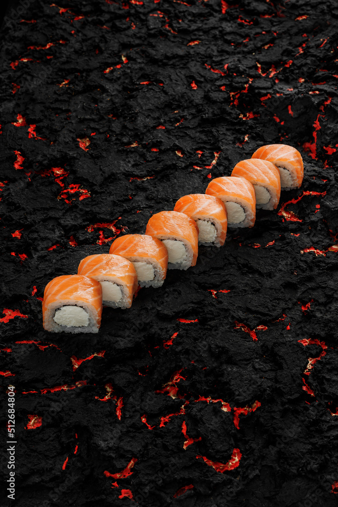 Philadelphia sushi roll with salmon and avocado. Japanese Traditional Cuisine on a Black stone background. Copy space