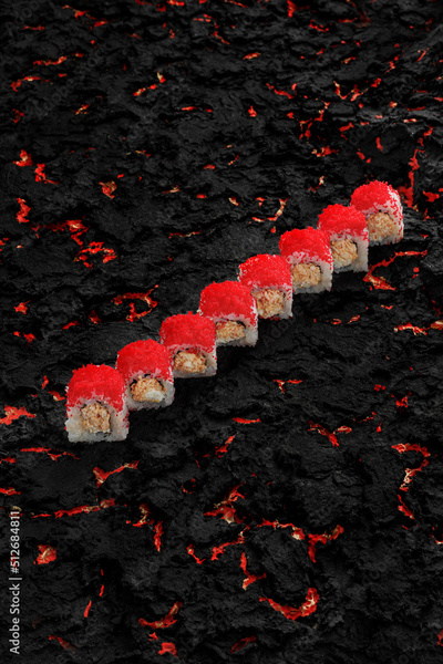 california roll sushi , rice roll with egg avocado.fish and crab. japanese food on a black stone background