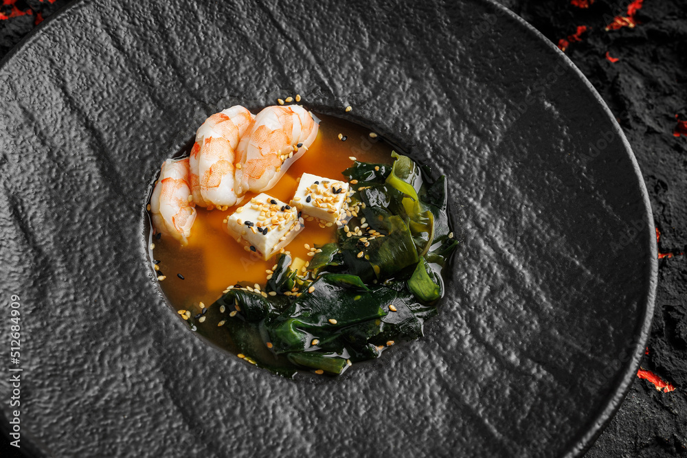 Asian miso soup ,soy sauce, greens and shrimps prawn. On a black stone background, top view
