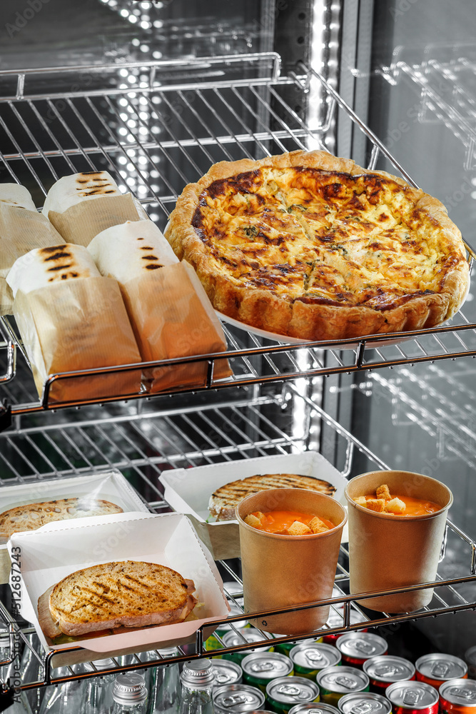Food to go on display window, wrap, kish with salmon, chicken, sandwich, soup