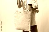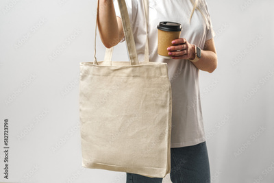 Cropped woman with cotton bag and paper coffee cup, studio shot