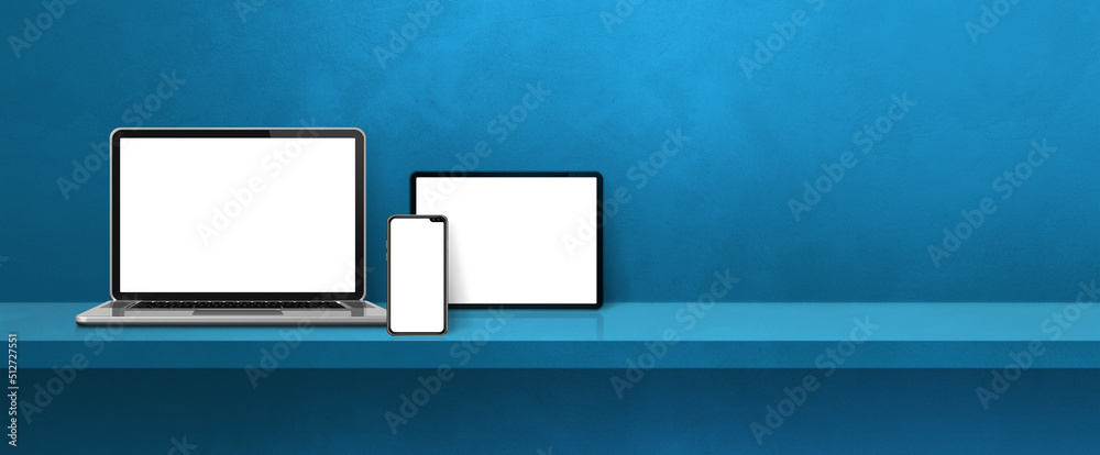 Laptop, mobile phone and digital tablet pc on blue wall shelf. Banner background