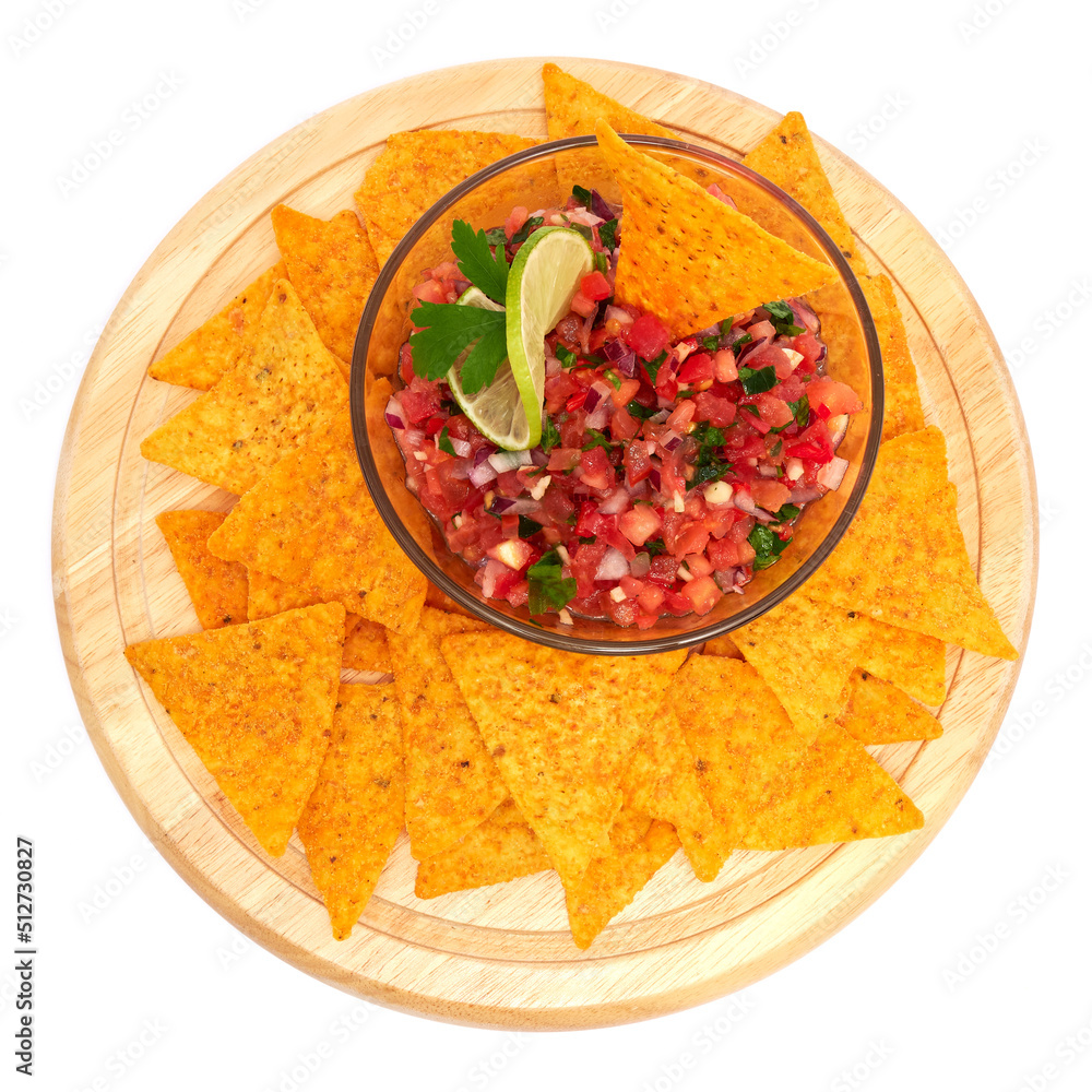Glass bowl of tomato salsa dip with Tortilla chips isolated on white background