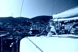 Beautiful young blond woman sitting on catamaran at sunny summer day at Hydra marina bay, Greece
