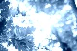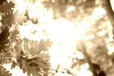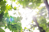 Upward glance to sun rays shines through forest trees. Scattered sunlight that filters through green oak leaves. Sunny summer nature background with sunshine radiant bokeh. Japanese Komorebi concept