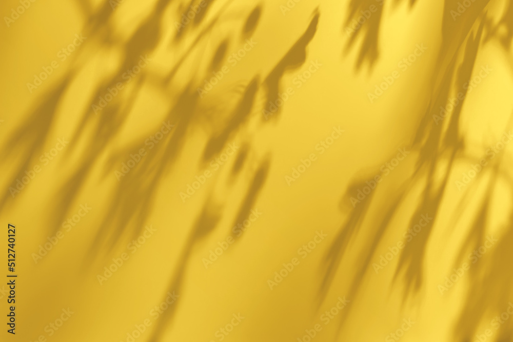 Shadow of leaves on solid yellow concrete wall texture. Abstract trendy colored nature concept background. Copy space for text overlay, poster mockup flat lay