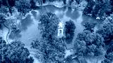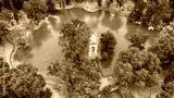 Aerial view of the small lake in Villa Borghese park. This pond is located in Rome, Italy. There are small row boats with people.