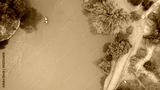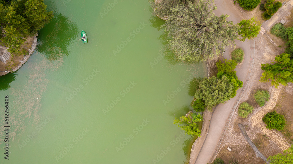Aerial view of the small lake in Villa Borghese park. This pond is located in Rome, Italy. There is a small row boat with people.