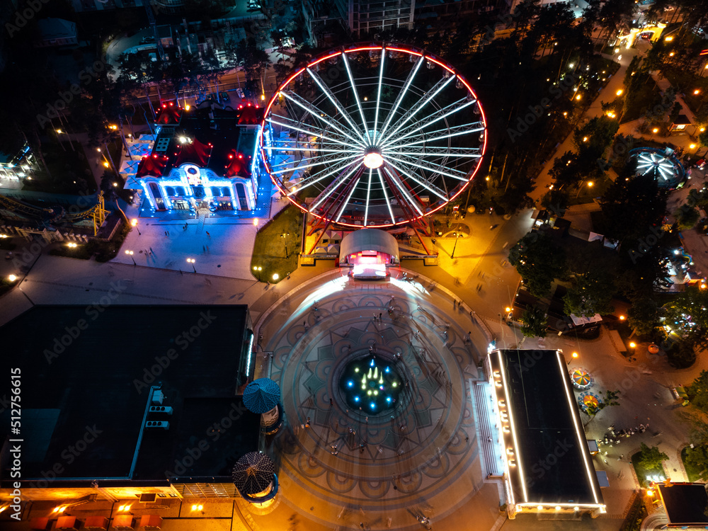 Aerial evening Ferris wheel, Kharkiv Central Park
