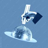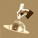 Contemporary art collage. Creative colorful design. Female with food chop sticks eating disco ball isolated over pink background