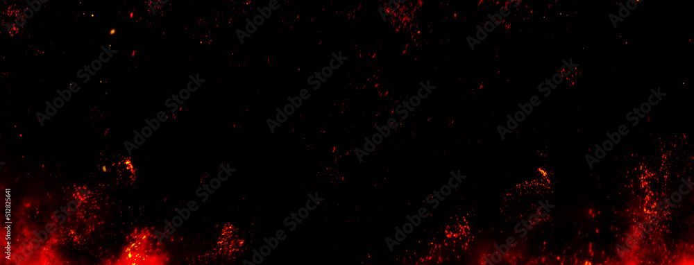 Fire embers particles over black background. Fire sparks background. Abstract dark glitter fire particles lights.