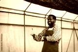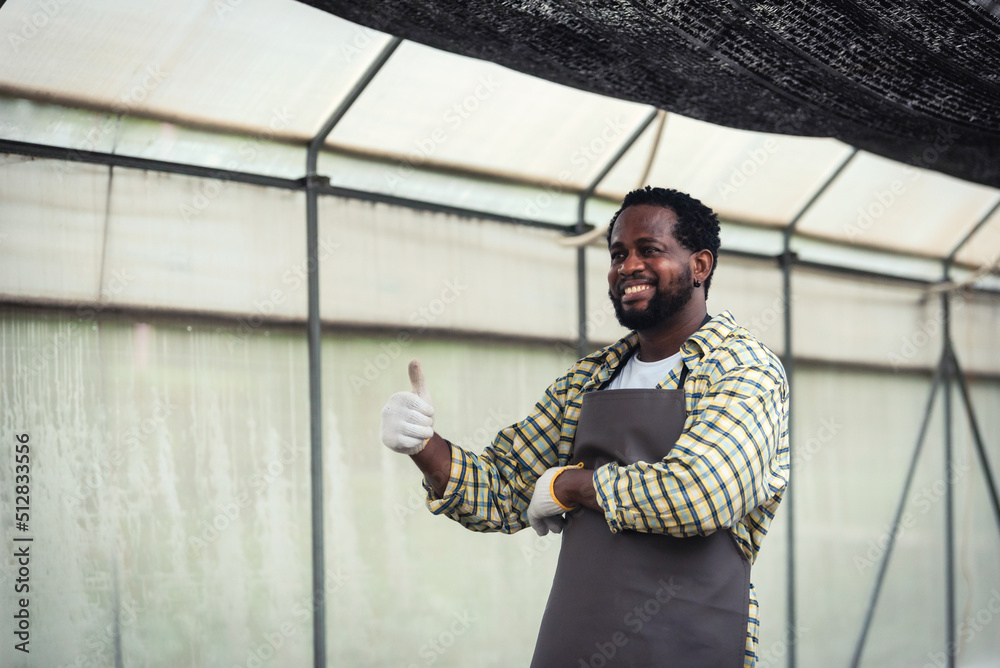 Portrait of Smiling African man farmer holding a crate of fresh plant at plantation in industrial greenhouse.