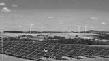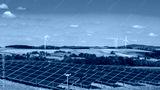 Wind turbines and solar panels in hilly rural area producing green energy