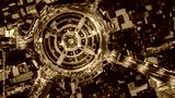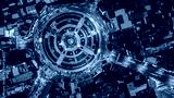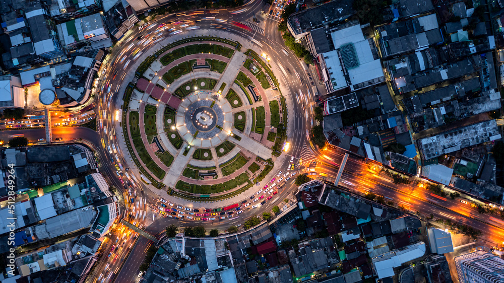 Aerial top view road roundabout interchange in city at night, Aerial view of highway and overpass in city at night.