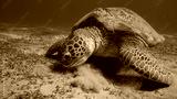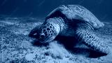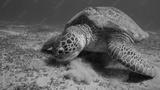 Big Sea Turtle green eats green sea grass on the seabed. Green sea turtle (Chelonia mydas) Underwater shot, Red sea, Egypt