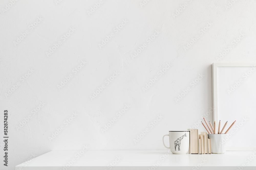 Home office, creative desk with office supplies and white wall. Bright and minimal workspace.
