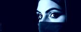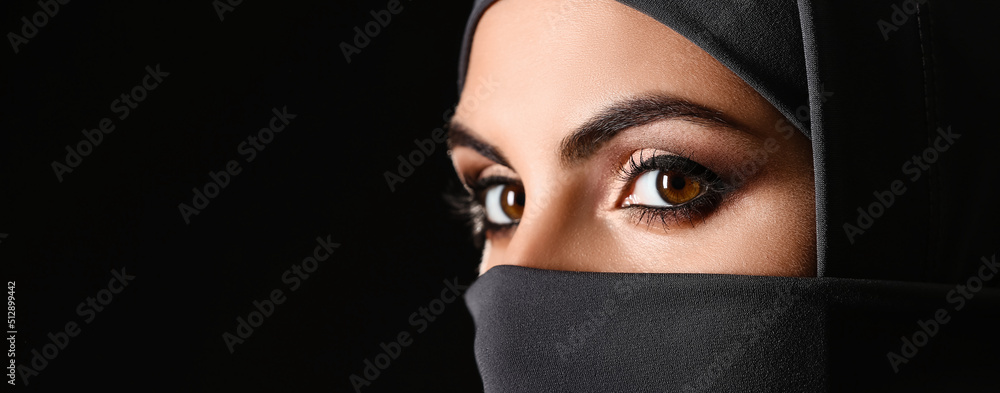 Portrait of beautiful Muslim woman on dark background with space for text, closeup