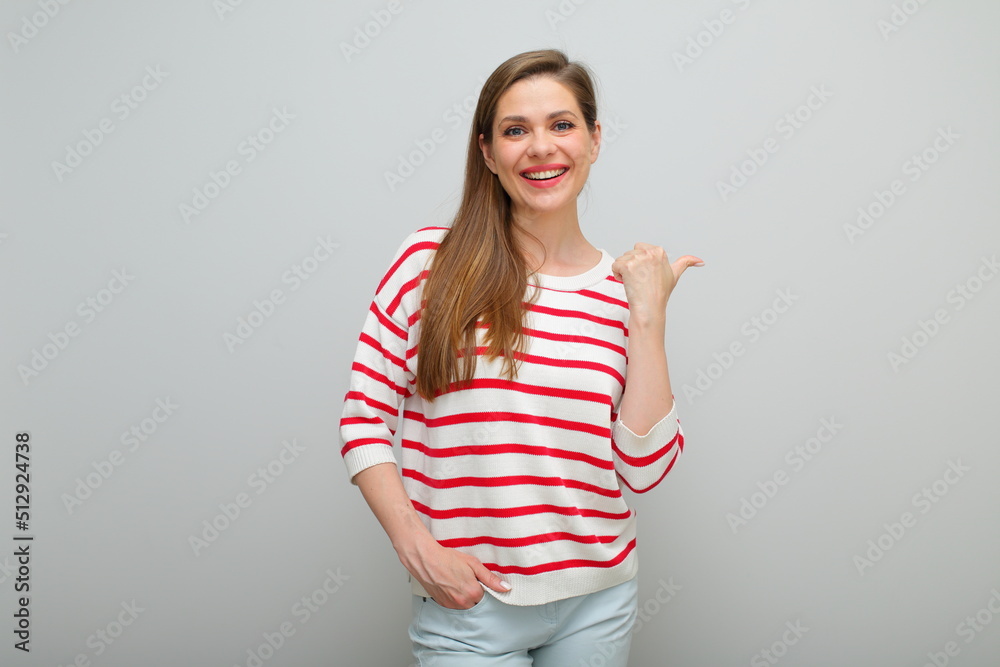 Smiling woman pointing away with thumb, isolated female studio portrait, girl in white sweater with red stripes..