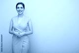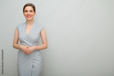 Young smiling business woman with short hairstyle standing with folded hands, isolated female studio portrait, young business lady in gray dress.