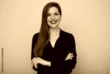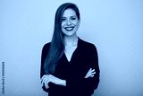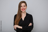 Smiling business woman in black shirt standing with arms crossed, isolated female portrait.