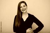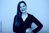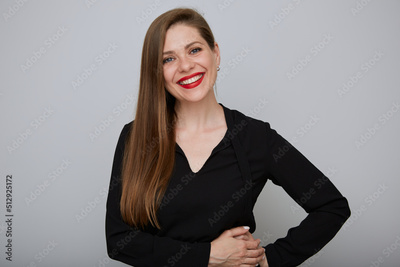 Smiling confident business woman or office worker in black shirt holding hands on hip and touching her chin, isolated female portrait.