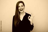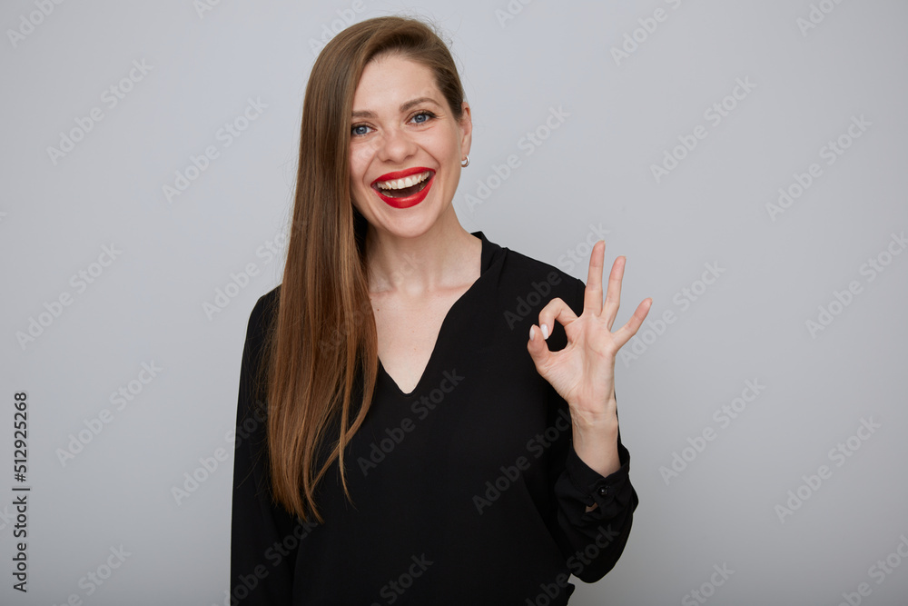 Smiling business woman in black shirt showing discount gesture zero or ok, isolated female portrait.