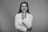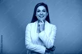 Smilng business woman touching her chin, face, isolated portrait with neon lights colors effect. Female model on neon colored background wearing white suit.