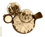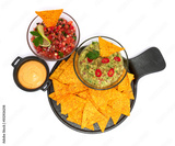 Salsa and guacamole Mexican dip sauce served in glass bowl with nachos or tortilla chips isolated on white background
