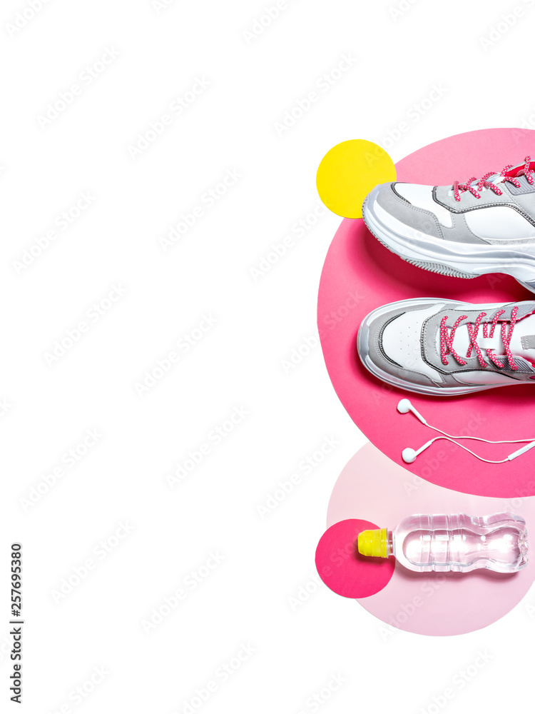 Profile portrait of woman with bare shoulders, bun hairstyle, isolated on blue wall background. Sleep mask wearing.