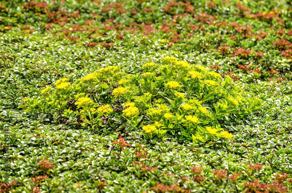 Close up of a yellow piece of sedum on a vegetatedroof