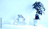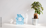 White wooden shelving against the wall. Green plants, lamp, books, natural decor.