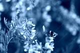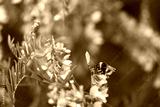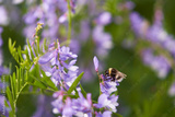 A blooming meadow with fir flowers of a shaggy vetch (vicia villosa). A bumblebee collects nectar from a flower. Selective focus.