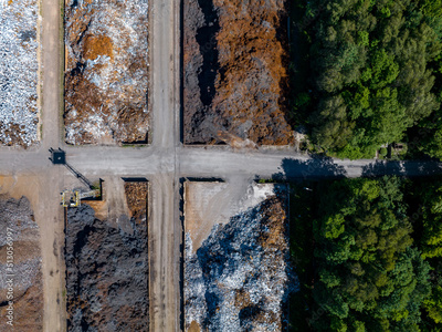 Scrap Metal Recycling. Aerial View of Industrial scrap Processing. Empty Wagons.