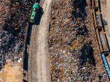 Scrap Metal Recycling. Aerial View of Industrial Scrap Processing. Heavy Machinery Working on Recycling Process.