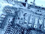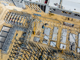 Aerial Photo Busy Industrial Construction Site. Factory Building. Construction Site with Cranes and Heavy Equipment.