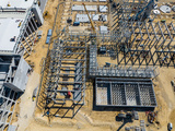Aerial Photo Busy Industrial Construction Site. Factory Building. Construction Site with Cranes and Heavy Equipment.
