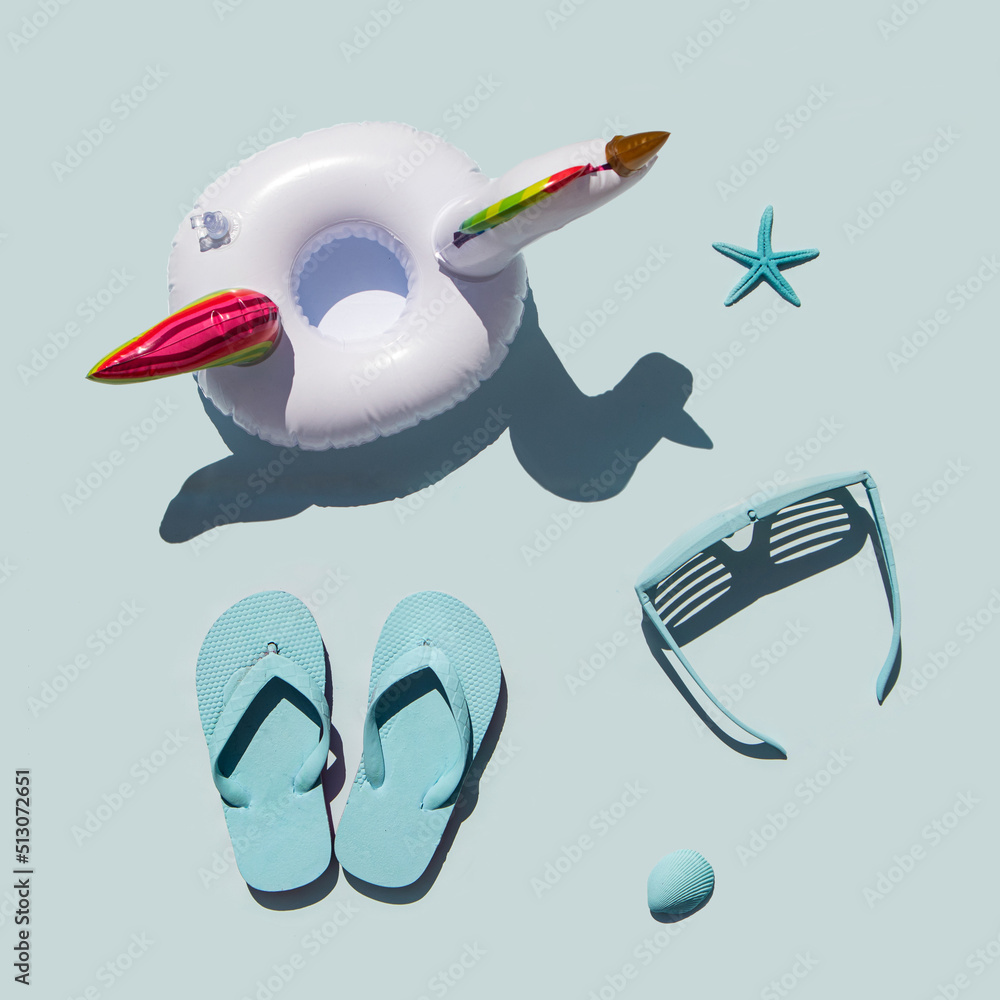 Minimalistic beach concept. Sea symbols idea. Sunglasses, flip flops, starfishes and seashell on pastel blue background. Creative summer concept. Holiday composition. Flat lay.