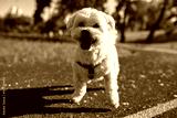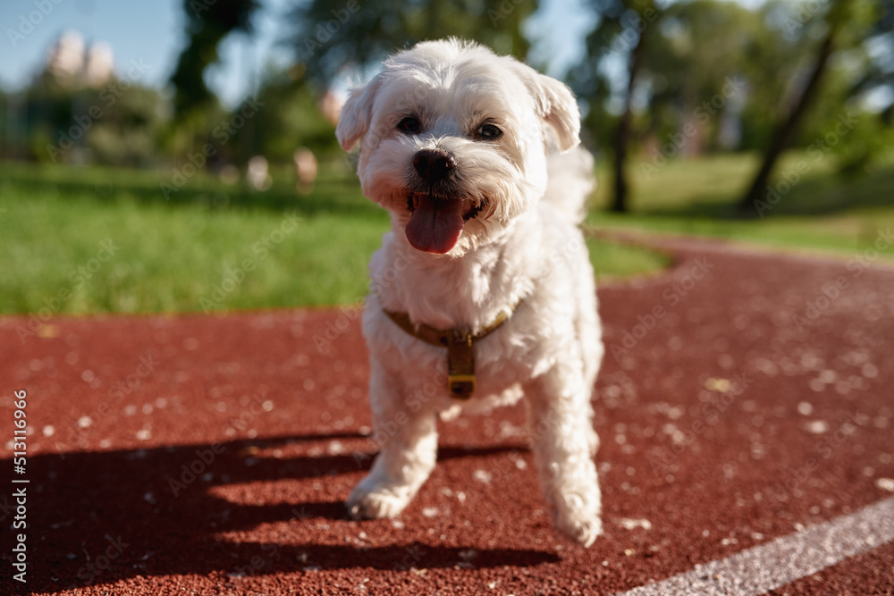 Portrait of Maltese dog on running track in park