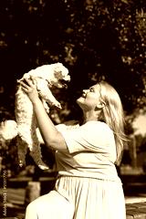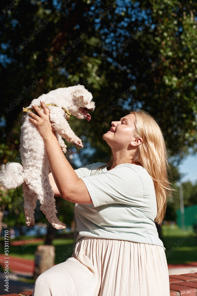 Girl hold and look at Maltese dog in blurred park