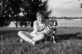 Boy hugging Staffordshire Bull Terrier dog on lawn