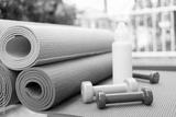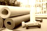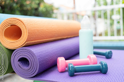 dumbbell and yoga mats on table, fitness healthy and sport concept