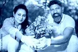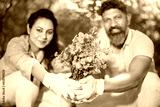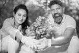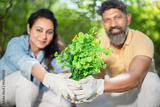 Portrait of happy indian couple hold plant outdoor garden activity. planting tree to save environment and reforestation concept. selective focus