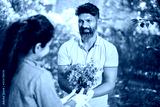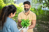 Portrait of happy indian couple wearing gloves holding plant outdoor garden activity. planting tree to save environment and reforestation concept.