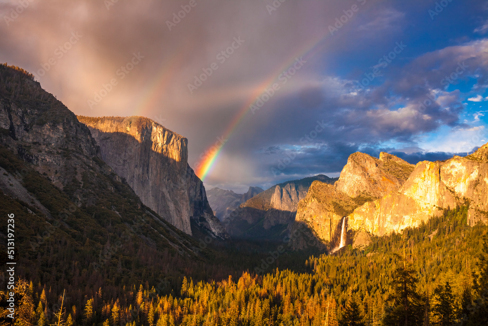 Double rainbow seen over the Tunnel View overlook in Yosemite National Park.