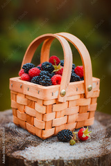 Fresh berries in basket. close-up of summer raspberries and blackberries outdoors