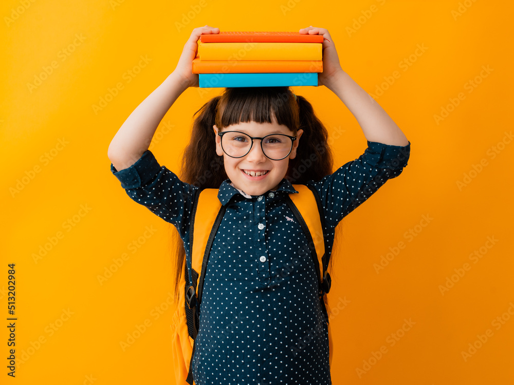 portrait of a schoolgirl girl with a backpack on a yellow background.
